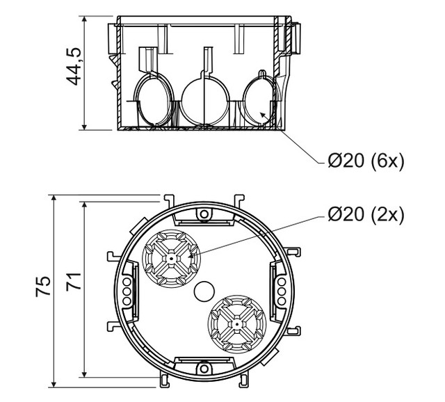 Призначені для монтажу приладів в багаторазових рамках. ∅70х45 (∅81 включаючи з'єднувальні лапки). Кількість вводів 8х∅20.
