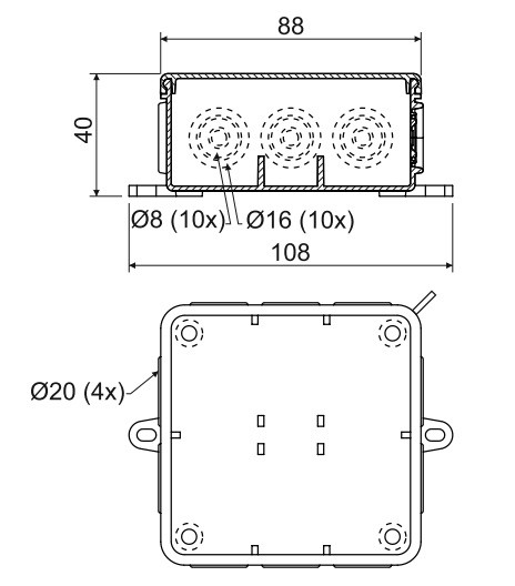 Розмір 85х85х40. Кількість вводів 4х∅20, 10х∅16, 10х∅8. Ступінь захисту IP54. Ступінь механічного захисту IK06. Матеріал корпусу - самозатухаючий поліетилен. Матеріал кришки - самозатухаючий поліпропілен.