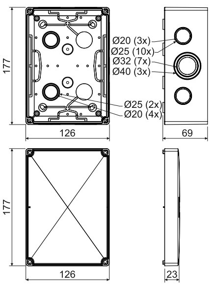 Розмір в закритому вигляді 176х126х87. Вхідні отвори: 7x Ø20 мм; 12x Ø25 мм; 7x Ø32 мм; 3x Ø40 мм, Ступінь захисту IP66. Кришка встановлюється за допомогою чотирьох гвинтів. Матеріал корпусу - самозатухаючий поліпропілен. Матеріал кришки - самозатухаючий полікарбонат.